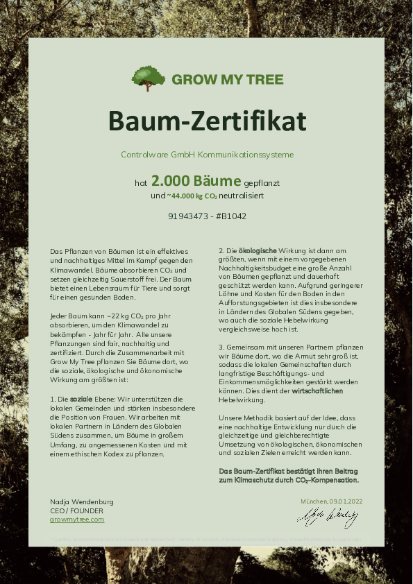 Wir von Controlware haben uns für das große sog „Co2 Climate Rockstar“ Paket von „Grow Your Tree“ entschieden – dabei hat uns unser Partner Grow My Tree davon überzeugt, dass Bäume pflanzen ein effektives und nachhaltiges Mittel im Kampf gegen den Klimawandel ist.