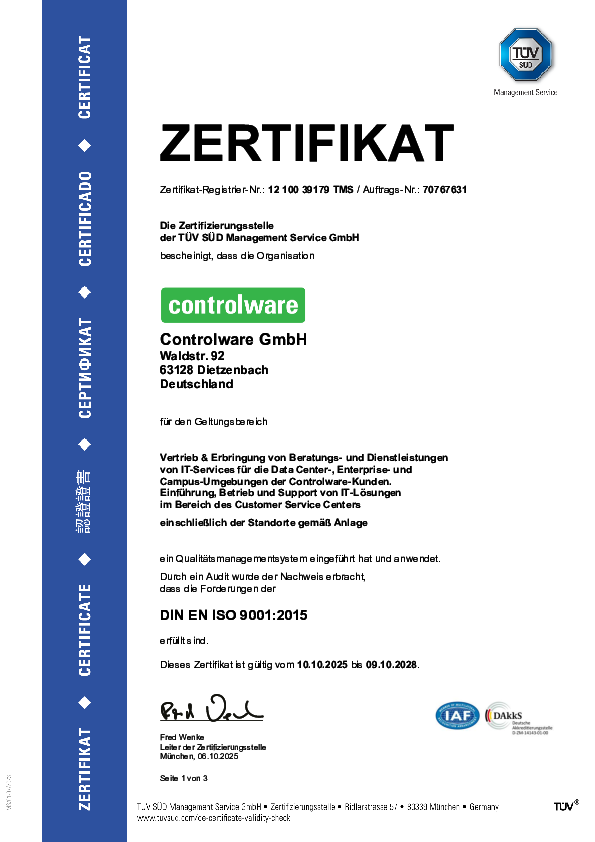 Das Zertifikat des TÜV SÜD gilt für alle deutschen Controlware Standorte inkl. des Controlware Customer Service Centers (CSC) in Dietzenbach und Berlin. Die Controlware GmbH hat ein etabliertes Qualitätsmanagementsystem, welches für die Geltungsbereiche „Vertrieb & Erbringung von Beratungs- und Dienstleistungen von IT-Services für die Data Center-, Enterprise- und Campus-Umgebungen der Controlware Kunden“ sowie „Einführung, Betrieb und Support von IT-Lösungen im Bereich des CSCs“ mit Zertifizierung die Anforderungen der DIN EN ISO 9001:2015 nachweislich erfüllt.