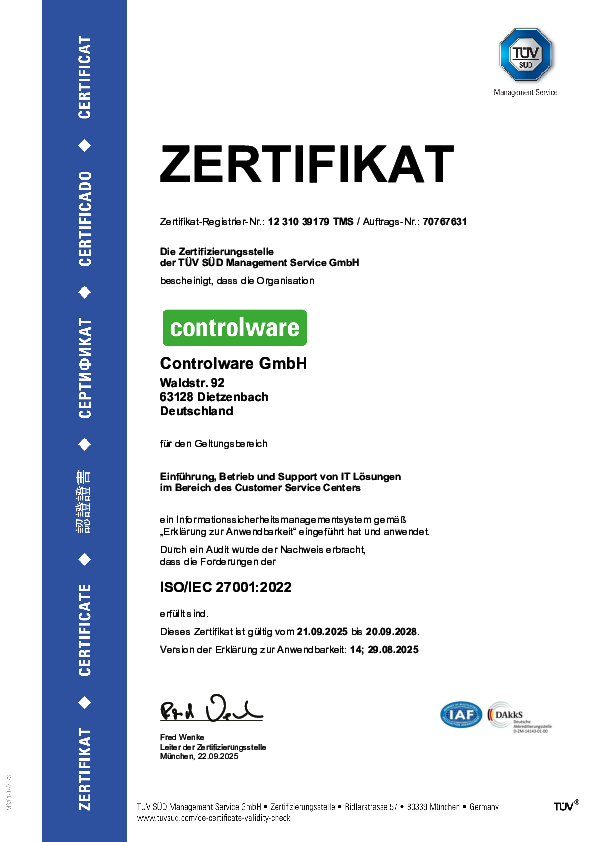 Das Zertifikat des TÜV SÜD bescheinigt, dass die Controlware GmbH seit 2010 für den Geltungsbereich „Einführung, Betrieb und Support von IT-Lösungen im Bereich des Customer Service Centers“ ein Informationssicherheitsmanagementsystem gemäß „Erklärung zur Anwendbarkeit“ kontinuierlich die Anforderungen der DIN EN ISO/IEC 27001:2022 erfüllt.